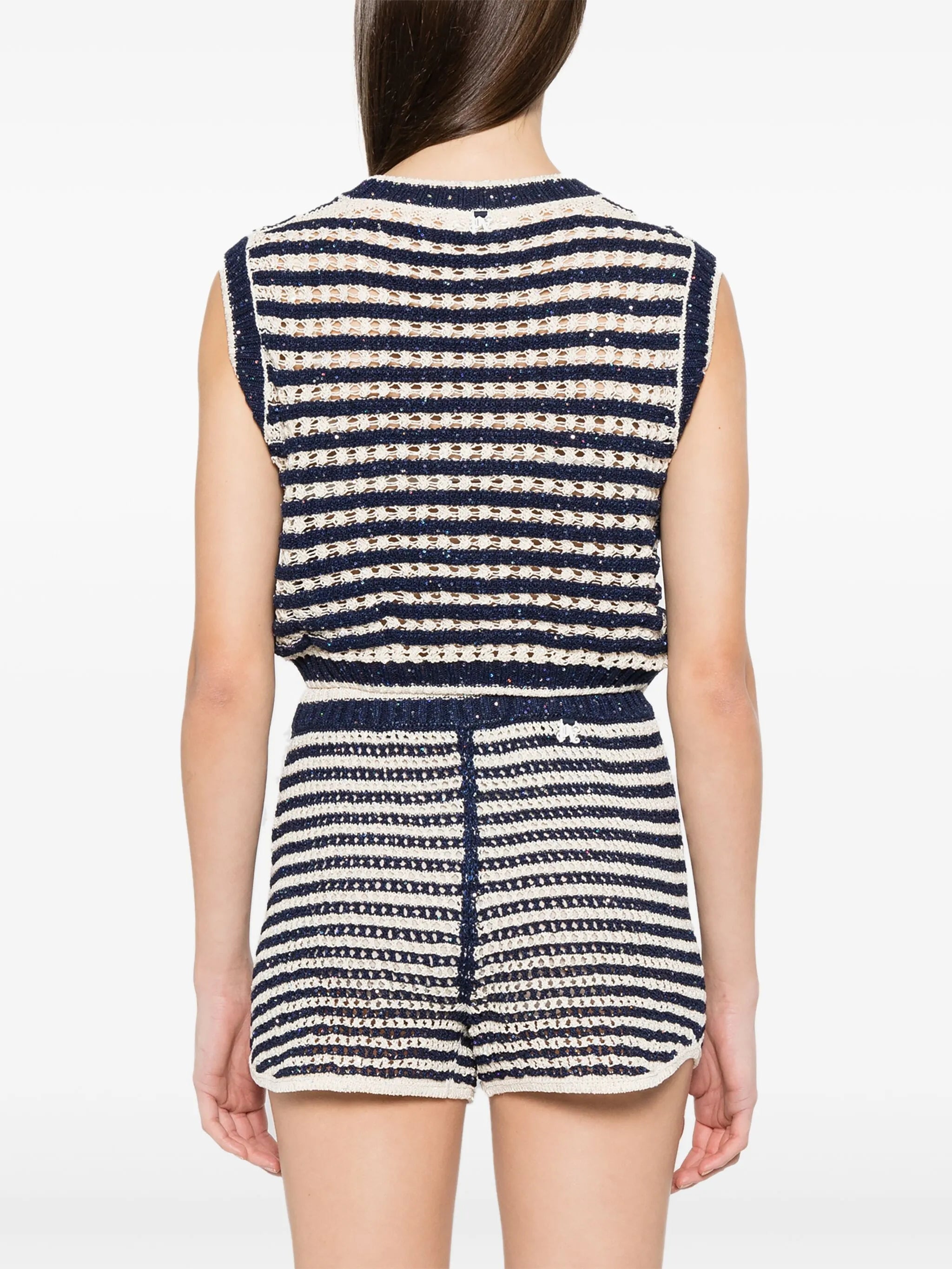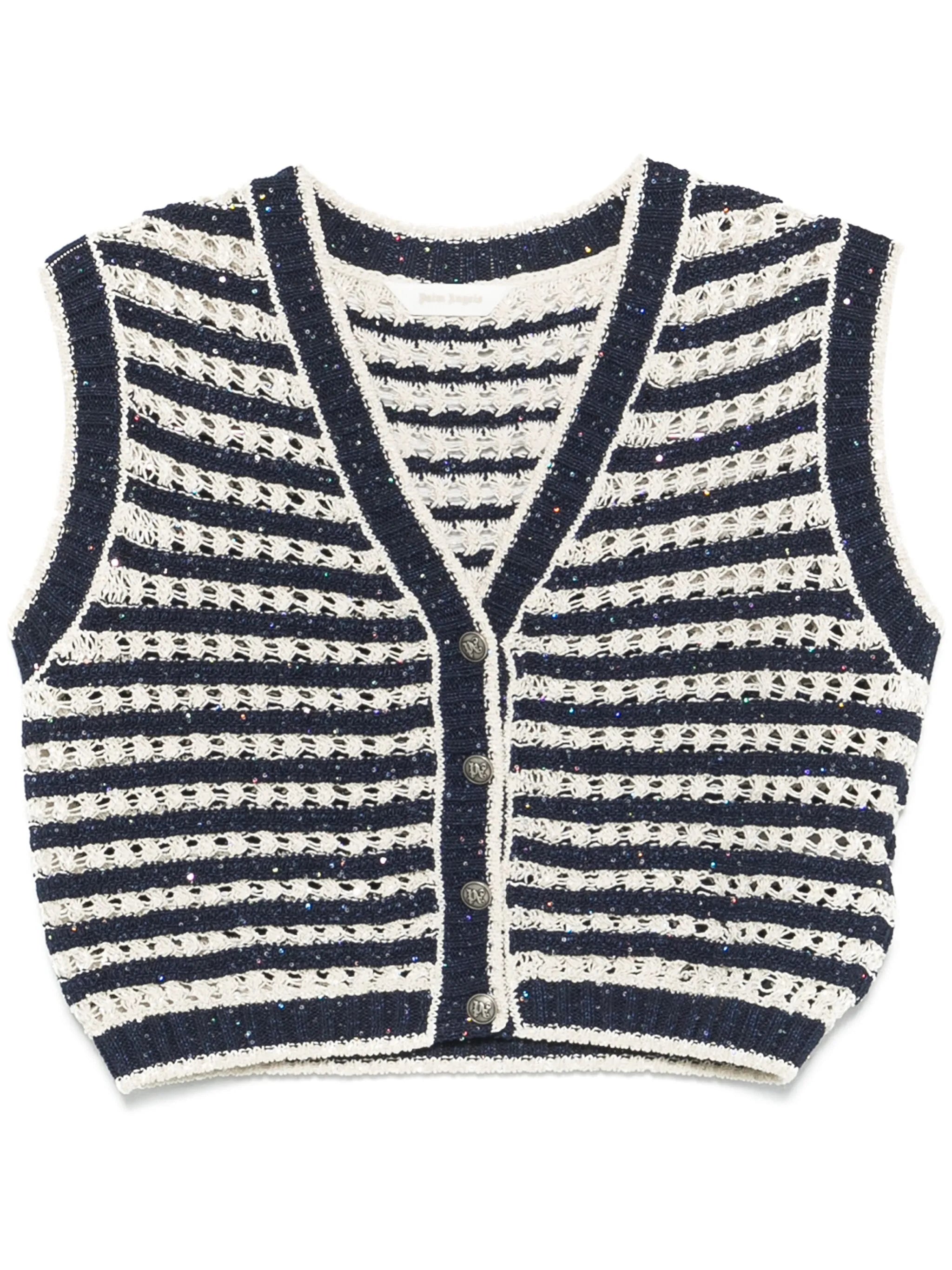 Dark blue, button closure at the front, sequin decoration, V-neck, sleeveless