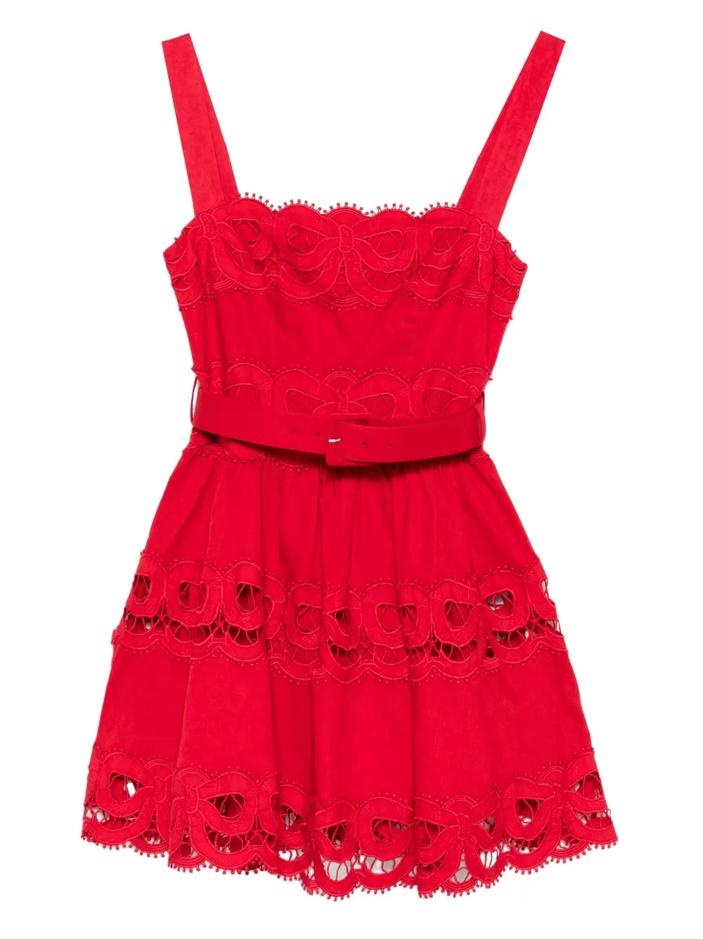 Cardinal red, tailored, belt, sleeveless, lace inserts