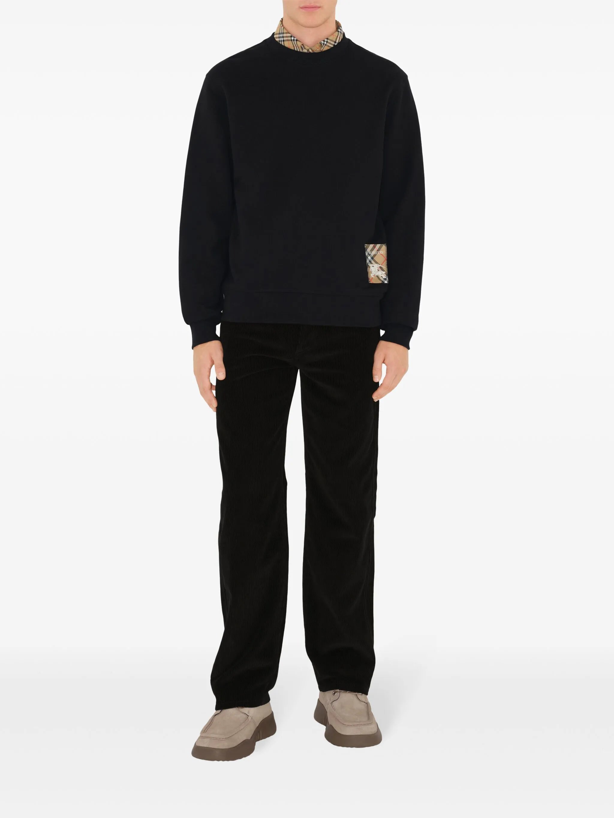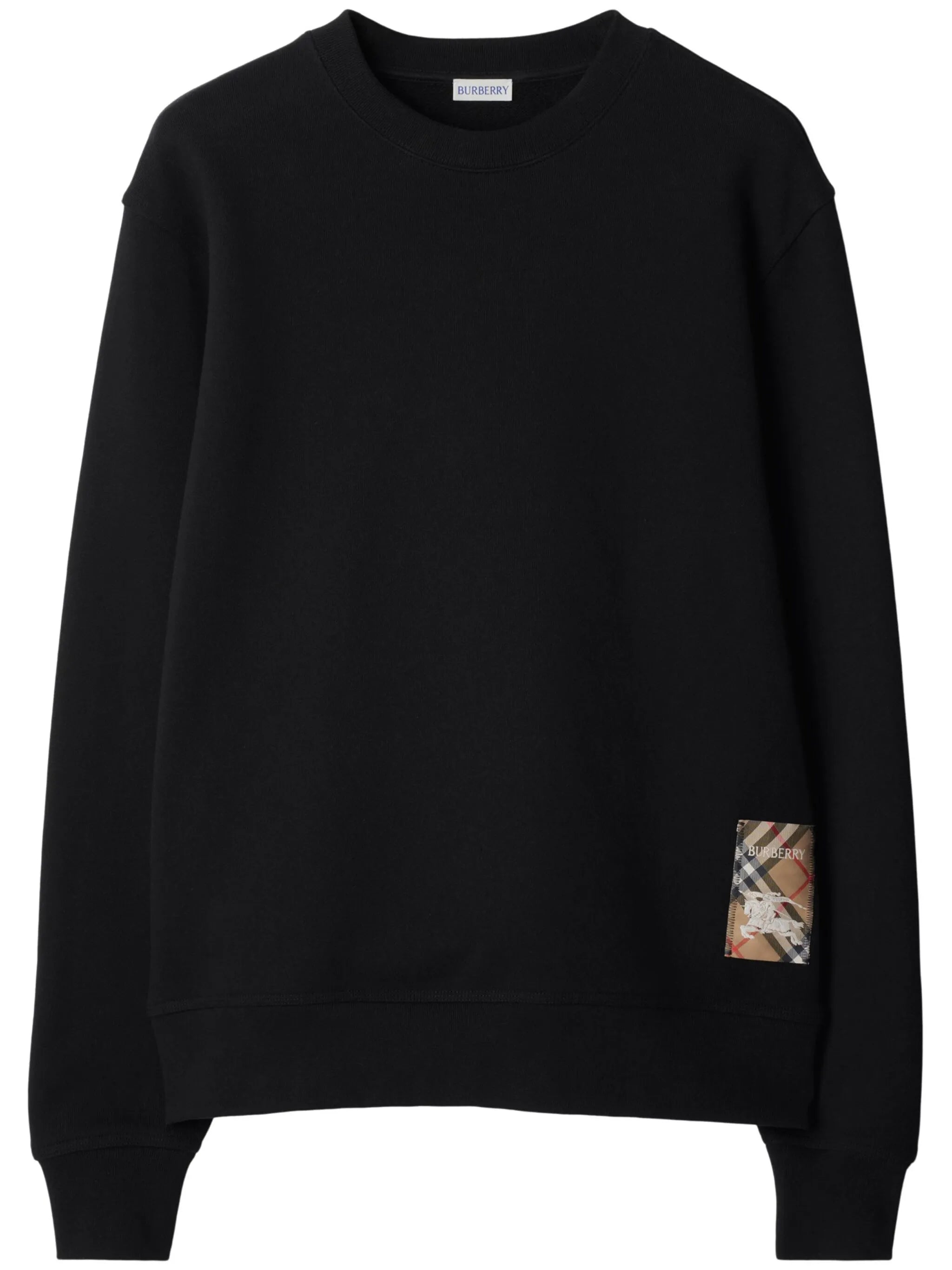Černá, bavlna, jersey textura, nášivka s ikonickým Burberry kostkovaným vzorem, kulatý výstřih, hluboké rameno, dlouhé rukávy, žebrovaný lem a spodní okraj