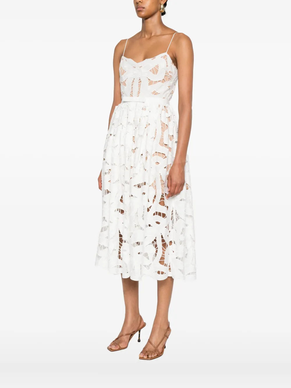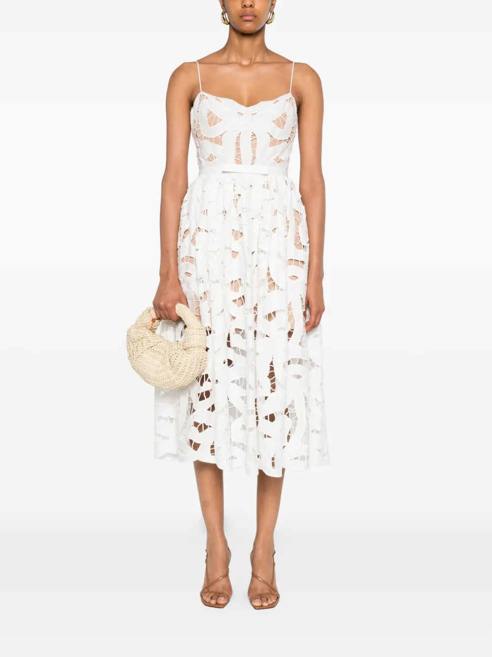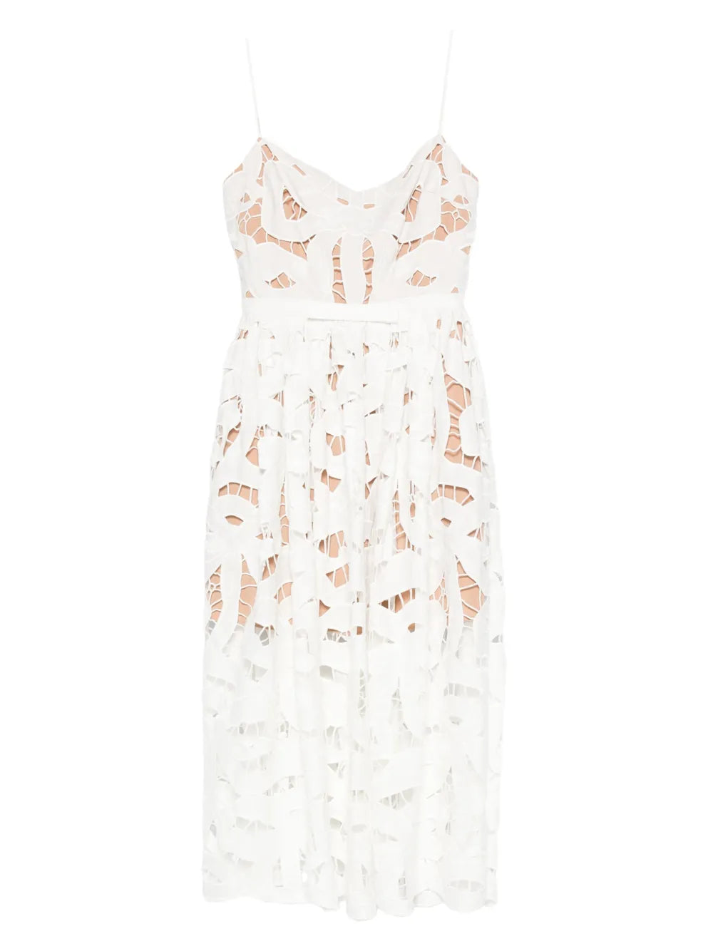 Bílá, květinová krajka, áčkový midišaty, výstřih ve tvaru srdce, tenká ramínka